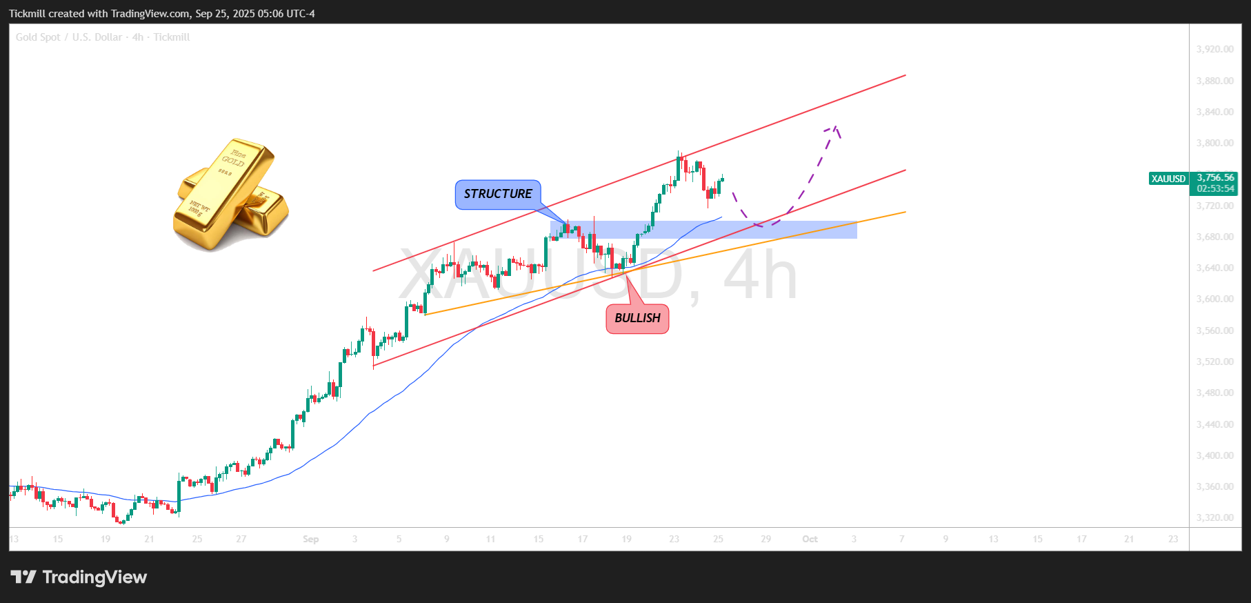 XAUUSD has been overall bullish on the 4H, climbing within an ascending channel. After the latest push, price is pulling back and eyeing the blue structure zone.