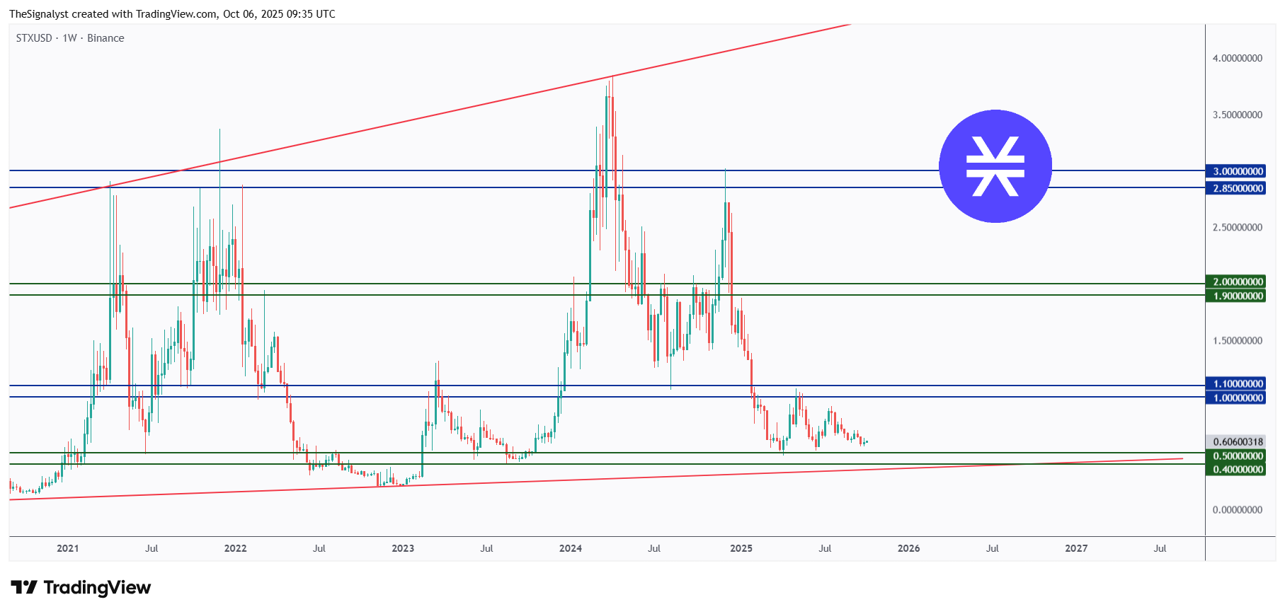 $STX has slid back to a confluence area: the ascending trendline plus the $0.40–$0.60 support. This zone has acted as a floor multiple times since 2023.