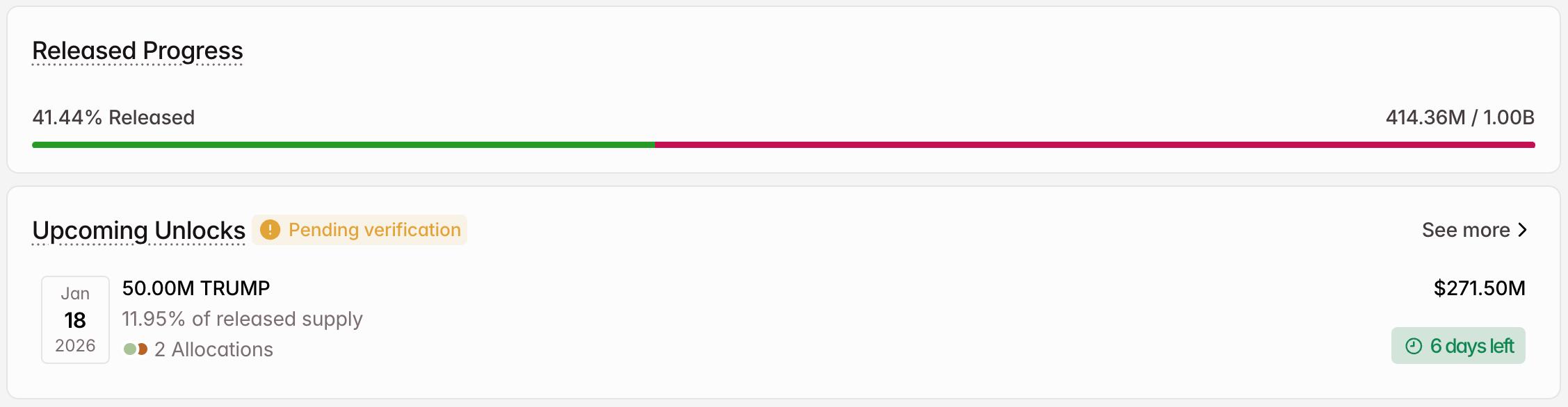 The Solana-based meme coin Official Trump will unlock 50 million tokens on January 18, valued at approximately $271.5 million. This accounts for nearly 12% of its released supply, a sizable injection for a meme-driven asset.