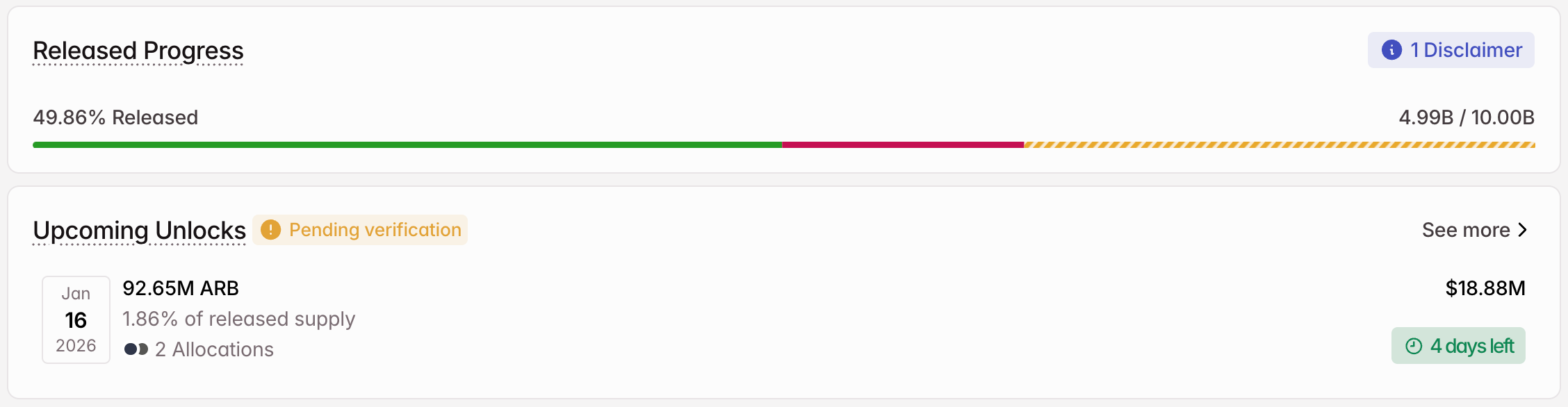 Arbitrum faces a more modest unlock on January 16, with 92.65 million ARB tokens entering circulation—worth around $18.9 million. This represents just 1.86% of the released supply, significantly less impactful than Ondo or TRUMP.