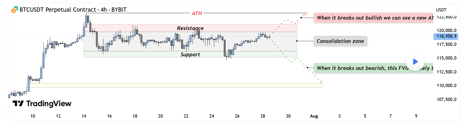 If price breaks out decisively above resistance, it would indicate buyers have absorbed all the supply at these levels. Such a breakout opens the path to a new all-time high and could potentially extend far beyond as trapped shorts are forced to cover. For traders, a retest of the breakout level on lower timeframes could provide a low-risk entry point for continuation to the upside.
